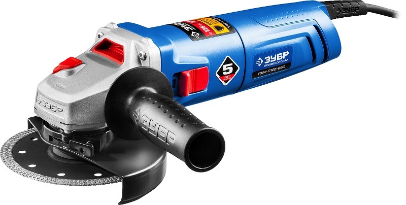 Угловая шлифмашина ЗУБР УШМ-П125-850, предназначена для зачистки, шлифовки и резки металлов, обработки бетона и камня при установке соответствующих шлифовальных, отрезных, алмазных кругов